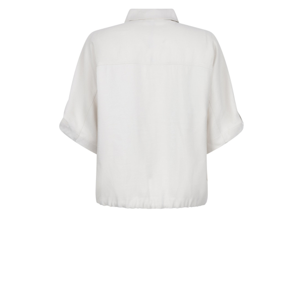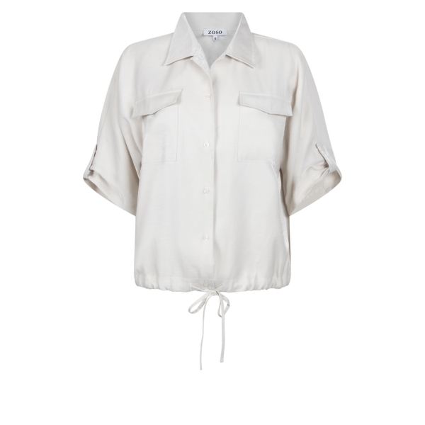 The BlouseSonjaKit from Zoso is an elegant women's blouse in cream white with a classic collar, button closure, ¾ sleeves and an adjustable drawstring in the hem.